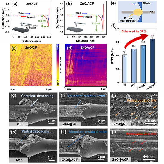 界面结合是影响复合材料力学性能的关键因素。基于原子力显微镜的粘附力表征分析表明,ZnO与ACF之间具有更高的界面粘附力(图5a-d),这源自于界面电荷运动介导的界面极化强度的增强。微脱粘测试及界面脱粘形貌表明,ZnO@ACF与树脂基体具有最高的界面结合强度(97.5MPa),相比于未经改性的再生碳纤维提高了57%,这得益于氧化锌纳米线增强的界面机械互锁效应(图5e-l)。