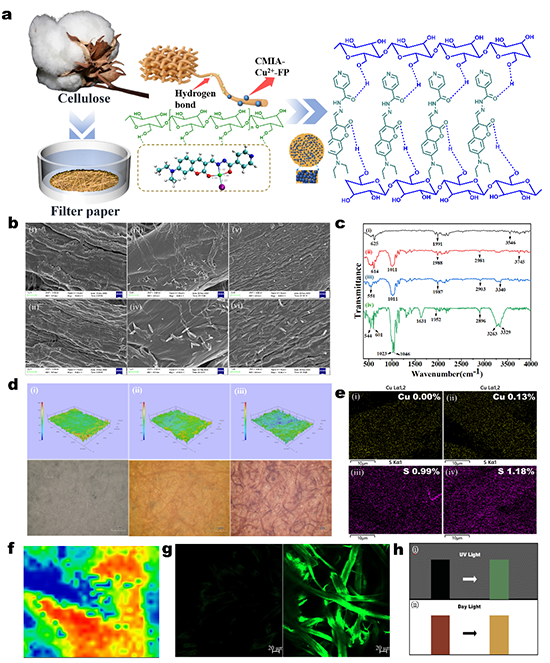 传统的定量检测Cu2+H2S以及监测饮用水和食品腐败的方法仍需要昂贵的仪器,复杂、耗时、样品前处理和劳动密集型操作。其繁琐和复杂的操作程序使其不适合对不安全的食物或水进行实时监测和目测。该团队提出了一种用户友好、高精度、快速响应和实时视觉监控的生物纸基双功能荧光平台。基于香豆素量子产率高、生物相容性好、光稳定性强等优点,设计合成了香豆素传感器CMIACMIA对铜离子具有良好的选择性和灵敏度,并且具有低检测下限(0.430 μM)。此外,CMIACu2+形成化学稳定的络合物CMIA-CU,能够选择性识别H2S,检测限为0.562 μM。将CMIACMIA-CU负载到纤维滤纸上,制备生物质纸基荧光材料CMIA-FP CMIA-CU-FP,用于Cu2+H2S的可视化实时监测。