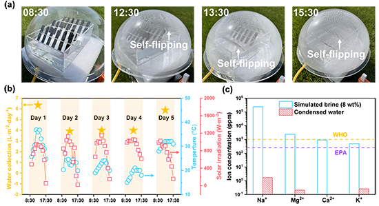 该跷跷板蒸发器可以规模化地拓展成集成式阵列,能在真实光照下从模拟高浓盐水中产生3.93 - 6.35 L·m-2·day-1的淡水。且该淡水已经满足世界健康组织(WHO)以及环境保护机构(EPA)的饮用水标准