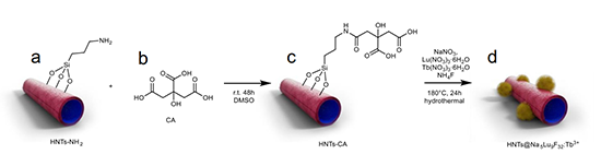 埃洛石纳米管,是一种具有特殊中空管状结构的天然纳米材料。埃洛石纳米管较大的空腔体积,及表面弱电荷导致的粒子间斥力,使其具有良好的水分散性。此外,埃洛石纳米管具有良好的生物相容性、低毒性、稳定性、低成本和易于表面改性等优势,是构建纳米复合材料的理想基底。上述特点启发他们以其为基材,制备具有X射线闪烁特性的纳米复合材料。