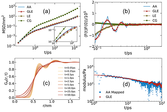 近期,吉林大学钱虎军教授团队基于能够准确描述粒子间径向分布函数的迭代玻尔兹曼反演方法与广义郎之万方程相结合,为了引入被约化掉的C-H键等化学细节对体系动力学性质的影响,利用含时记忆内核函数,以全原子模拟中获得的速度自相关函数为纽带,极大地优化了粗粒化模型中以均方位移、速度自相关函数、力自相关函数、应力松弛模量等为代表的动力学性质,获得结果与全原子模拟一致。为了兼顾精准度与计算效率,该方法将复杂的长时间记忆内核拆解为一个马尔可夫的Rouse摩擦系数,以及非马尔可夫的短时间记忆内核,前者主导长时间的扩散行为,后者决定了局部的碰撞与亚扩散行为。同时,作者开发了一套系统化的优化流程,用于时间依赖的记忆内核的构建。该方法有望被推广至更多的复杂聚合物体系,在粗粒化模型所能达到的介观模拟尺度,针对特定体系,实现具有全原子模拟精度的化学特异性的多尺度结构及动力学性质的预测。
