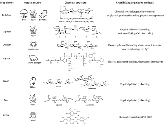 图3生物质基凝胶聚合物电解质中常用的生物聚合物的基本化学结构以及交联方式