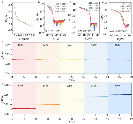 该工作通过在有机半导体层中掺入微量纳米颗粒,在不影响器件性能的前提下通过改变费米能级随温度的变化趋势有效调控阈值电压随温度的变化情况,使阈值电压与迁移率可以相互补偿,从而在有机场效应晶体管中实现零温度系数点行为。当器件工作于零温度系数点,可实现温度不敏感的源漏电流,有效提高了有机场效应晶体管的温度稳定性。