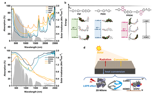近日,大连理工大学蹇锡高院士团队的翁志焕教授首次发现杂萘联苯聚芳醚材料可以弥补MXene在紫外和近红外波段的吸收不足,并与MXene光热协同实现太阳光的高效宽带吸收。分子内的高度共轭的π键和DHPZ结构所增加的π-π堆积显著增强体系的光吸收性能。我们将杂萘联苯聚芳醚砜酮进行磺化改性赋予优异水溶性,然后与羧化壳聚糖通过氢键和静电相互作用构筑具备仿生鹰绒羽结构的太阳能界面蒸发器,特殊的分级结构既减少了热量损失,又防止了水的过饱和和盐的快速积累,可以实现了91.7%的高光热转换效率,在一个太阳强度照射下水蒸发速率可达2.34 kg m-2 h-1,该体系的成功构建有望将实验室中测量的光热转换性能优势转化为实际中的连续脱盐和废水净化应用,是发挥聚芳醚基材料的光热性能潜力的新起点。该工作以“Biomimetic polyaryl ether-based aerogels for efficient interfacial solar water vapor generation”发表在Chemical Engineering Journal上。论文第一作者为大连理工大学化工学院博士生张慈剑,通讯作者为翁志焕教授。该研究得到了国家重点研发计划项目、国家自然科学基金面上项目和中央高校基本科研业务费的共同资助支持。