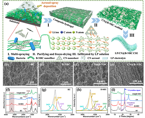 聚环氧乙烷(PEO)基聚合物固态电解质以其高安全性和界面兼容性成为学术研究和商业化应用的重要选择。然而,PEO机械强度不足且导通Li+能力有限,这限制了其在柔性高能量密度电池中的应用。为了解决上述问题,作者利用生物合成过程,借助外源材料杂化和碳源分子修饰等手段成功将g-C3N4 (CN)和氨基基团引入细菌纤维素(BC)空间网络结构,浇筑LiTFSI/PEO (LP)后制备得到具有良好机械性能和高效离子传导能力的复合固态电解质(CSE)。