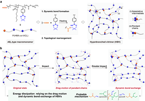 图1. 超支化类玻璃高分子 (Hyperbranched vitrimer, HBV) 的结构设计及其可能的能量耗散机理图。
