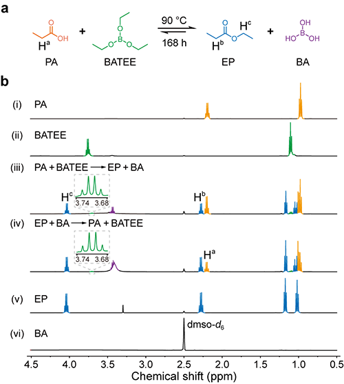图2. 基于丙酸和硼酸三乙酯小分子酯交换模型反应化学式及其核磁氢谱图。