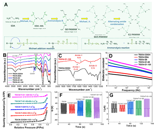 基于以上问题,本工作以EDC/NHS催化体系的酰胺化反应、环氧基团碱性开环加成反应和环氧基-氨基反应为基础,研究了TOCN与常见四种廉价小分子胺(乙二胺EDA、二乙三胺DETA、三乙四胺TETA、四乙五胺TEPA)和超支化多胺(G.0, G.1代聚酰胺-胺,Polyamidoamine, PAMAM)在水环境下与TOCN表面的羧基进行酰胺化交联反应,系统探究了胺改性过程对TOCN及摩擦电材料性能的提升影响,制备了一系列多级胺改性的TOCN基摩擦电材料。