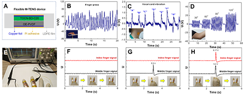 图7:基于交联氨基改性TOCN摩擦电材料的柔性微接触分离TENG装置和传感应用(A)柔性M-TENG装置原理图(A);(B-D)柔性M-TENG装置在手指按压(B)、声带振动(C)和手臂弯曲(D)下的能量收集过程;(E-G)柔性M-TENG手指弯曲传感装置:照片(E)和不同手势下的信号输出(F, G, H)