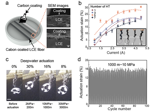 动物肌肉是自然界中最高效的柔性驱动器,对于人工肌肉的发展起到了重要的启发作用。在众多人造智能材料中,液晶弹性体(LCE)具有与天然肌肉相似的可逆线性驱动应变能力。最近的研究表明,当LCE制成纤维时,其较大的比表面积使其能够实现与天然肌肉类似的超快速驱动。然而,单根纤维无法为实际应用提供足够的力量,多根纤维合并使用时驱动速度会因为比表面积的减小而降低。因此,人工肌肉目前还未能以实际应用的尺寸实现与动物肌肉相当的快速线性驱动。此外大多数基于智能材料(包括LCE)的人工肌肉的环境适应性有限,主要应用场景都局限于空气环境中,难以像水生动物的肌肉一样支持软体机器人的水下运动。即便已有基于介电弹性体的人工肌肉实现了深海驱动,但其线性变形有限,并且受到破坏时会快速失效,工作鲁棒性不足。