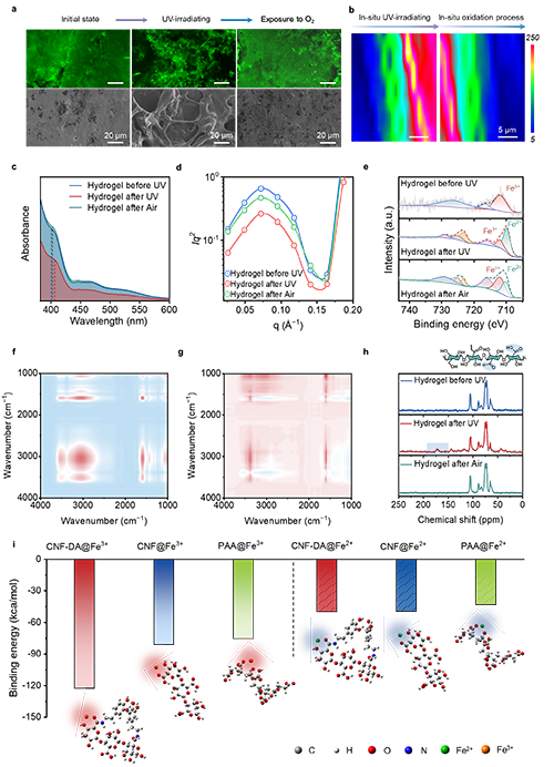 图1光驱动超分子网络工程策略的设计及动态CNF-DA/PAA@Fe3+水凝胶的制备。