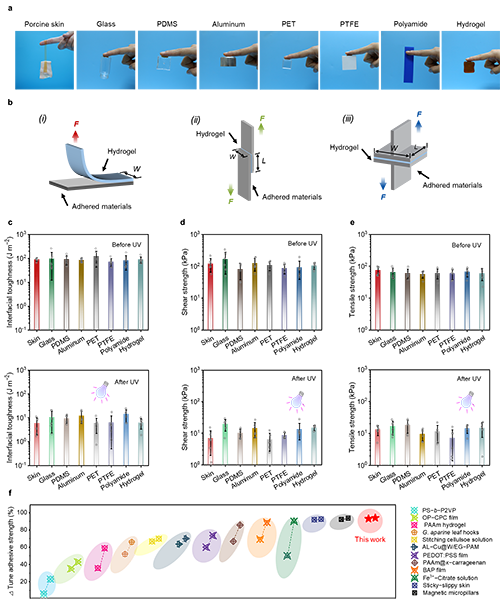 具有按需粘附-分离特性的自供电水凝胶电子皮肤在人机互动、智能电子和柔性可穿戴等领域具有广泛的应用潜力。目前,水凝胶可逆粘附-分离性能的实现主要通过可逆共价和非共价键、以及利用外部刺激产生的物理拓扑缠结等方式。然而,现有的粘附-分离策略过度依赖于复杂的预处理和粘附体的物理属性,因此通过更为简单、快速且通用的方式构建按需调控的粘附-分离型水凝胶仍极具挑战性。