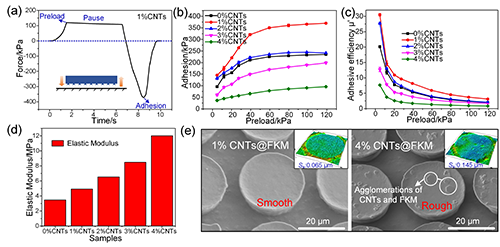 近期,中北大学祝锡晶教授团队联合西安交通大学邵金友教授/田洪淼教授团队提出了一种新型的氟橡胶&纳米填料基仿生干粘附结构,该干粘附结构通过仿生雄性金边龙虱跗节处的吸附垫,在接触末端引入了阵列的“吸盘状”微结构。由于氟橡胶与碳纳米管填料固有的耐高温特性及“吸盘状”末端结构设计,该干粘附结构在室温至大于200℃的宽温度区间内均可展现出高于常规聚合物基仿生干粘附结构的粘附强度(>350 kPa)及粘附效率(可达77.7)。更重要的是,该干粘附结构在高温环境下可实现无痕粘附,不会对目标表面造成污染,这是常规聚合物基仿生干粘附结构所无法达到的。此外,还可通过调节纳米填料的含量来精确调控结构的整体等效模量,从而实现粘附强度的进一步增强,相应的有限元仿真也验证了这一调控机制。最后,干粘附结构被用作抓手的接触表面进行了应用展示,其可在室温及高于200℃的环境下对诸如玻璃基板及硅晶圆等精密易碎物料实现可靠无痕抓取,展现了巨大的应用潜力。
