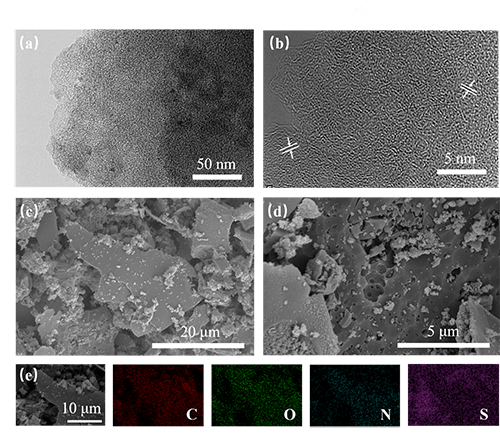 通过简单水洗、酸洗去除盐模板后,用扫描电子显微镜(SEM)、能量色散光谱仪(EDS)、透射电子显微镜(TEM)和高倍率透射电子显微镜(HRTEM)对得到的三维ECSK材料形貌进行了研究。如图2c所示,制备的ECSK材料由许多不同形状的碳块组成,其表面粗糙且多孔,材料的多孔结构可归因于前驱体和硝酸钾的燃烧活化作用。碳材料的孔形成的空腔和孔隙提供了大量的运输通道和富含缺陷的活性位点。依靠KCl和K2SO4的模板熔融可以帮助材料形成片状结构,却难以形成多孔结构,只有加入了硝酸钾盐模板的样品才具有多孔结构。