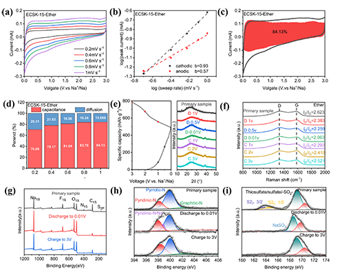 图 5 (a) 0.2-1.0 mV s-1 不同扫描速率下的 CV 曲线;(b) 阴极和阳极峰 ln(i) 与 ln(υ) 之间的相应线性关系;(c) 扫描速率为 1.0 mV s-1时的电容贡献率;(d) 不同扫描速率下的电容贡献率;(e) 不同充放电电位下相应的非原位XRD图样;(f) 非原位拉曼光谱;(g) 首圈非原位 XPS 测试;ECSK-15 在不同放电/充电深度下 (h) N 1s 和 (i) S 2p 峰的相应变化。