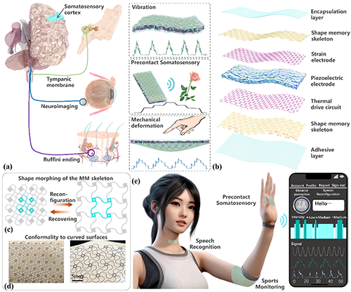 力学超材料由于具有优越的力学性能已被广泛应用于航空航天、柔性电子等多个领域。柔性电子器件与待测组织的紧密贴合与动态随形能力对测量数据的准确性至关重要,提升柔性电子器件的顺应性能显著降低器件的接触阻抗、提升信噪比、防止运动伪影的产生。然而由于生物组织和人造材料的不同性质及其界面的复杂性,实现身体随形的电子器件仍面临着突出挑战。利用具有自感知和形状记忆功能的材料制造智能力学超材料,有望协调柔性电子器件与不同生物组织之间的力学失调,并实现力学性能之外的主动功能,如传感、能量收集、致动、自适应、计算和信息处理。本文通过将形状记忆超材料和压电材料整合到电子皮肤结构中,实现了电子皮肤的多模态信号感知和形状记忆驱动功能,该电子皮肤在物联网、脑机接口等革命性领域具有广阔的应用前景。