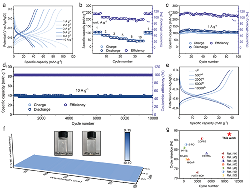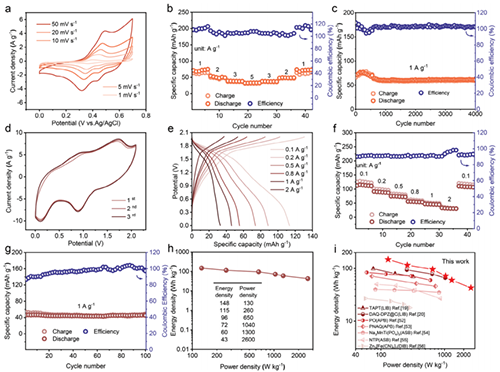 水系双离子电池(ADIBs)因为具有高安全性、低成本、无毒性等优点,被认为是一种非常有前景的储能体系。然而,大多数具有刚性结构的无机电极材料容易发生严重的体积变化,活性位点暴露有限,亲水性差,导致电极结构损伤和容量衰减,从而影响电池的循环稳定性和寿命。与无机电极材料不同,根据电荷补偿离子的类型,具有氧化还原官能团的有机电极材料可分为n型、p型和双极性。其中,双极有机电极材料因其与阴离子和阳离子的协同配合而引起了极大的兴趣,可以用作对称电极来组装全有机ADIBs,从而消除了使用两种不同电极材料的局限性。但是大多数小分子有机电极材料易溶解性差,导致循环稳定性差,而大多数聚合物材料表现出较差的导电性,这是阻碍聚合物基电极材料发展的因素之一。