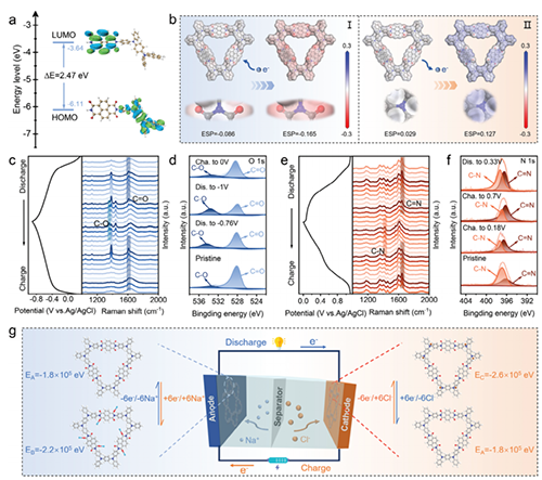 通过原位拉曼与非原位XPS结合理论计算来研究NTPI-COF作为全电池对称电极的电荷/离子存储机理。结果表明,作为负极时,NTPI-COF的三对C = O对角线位置更容易结合Na+离子并接受电子;作为正极时,六个C-N活性中心倾向于吸收Cl–离子并释放电子。