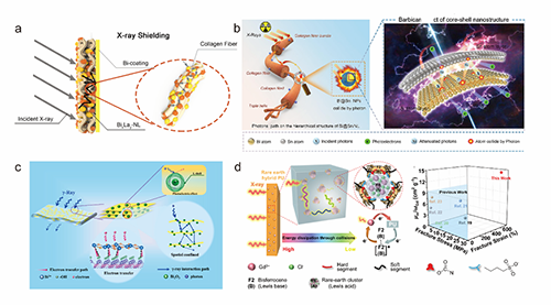 图6 a) Biz@BixLay–NL屏蔽X射线;b)双金属核壳纳米结构对光子衰减的巴比肯效应;c) γ射线与Bi2O3-Ti3C2Tx/EP复合材料相互作用机理图;d) Gd3+杂化双茂铁基聚氨酯X射线衰减机理及辐射性能。