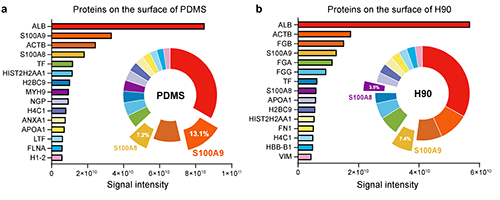 蛋白质吸附是异物反应过程中至关重要的初始步骤,研究植入物植入早期后表面蛋白质的吸附情况,有助于深入了解EVADE材料降低异物反应的机制。他们通过蛋白质组学鉴定了植入后24小时吸附在H90和PDMS表面的蛋白质种类(图3)。结果显示,在24小时内,白蛋白是 PDMS 和 H90 材料表面吸附量最大的蛋白质。在 PDMS 表面,炎症相关蛋白 S100A8 和 S100A9 的比例较高,分别为 7.2% 和 13.1%,而在 H90 表面的吸附量则显著较低,分别为 3.5% 和 7.4%。这些结果表明,S100A8/A9 蛋白的表达和吸附可能会加剧炎症反应,进而促进体内 FBR 的发生。