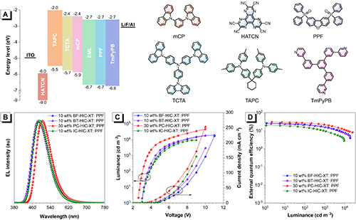 图4. (A)器件能级图和不同功能层材料的分子结构;基于BF-HIC-XT、BT-HIC-XT、PC-HIC-XT和IC-HIC-XT的器件性能:(B)EL光谱、(C)亮度?电压?电流密度曲线和(D)外量子效率?亮度曲线