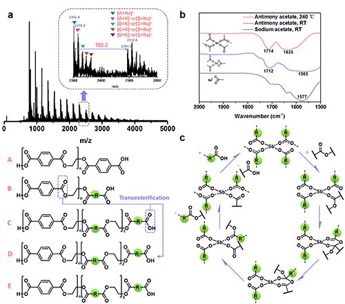 图6 PET升级回收的机理 (a)1h加热产物MALDI-TOF-MS谱和酯交换机理;(b)不同温度下醋酸锑与醋酸钠的红外光谱;(c)羧基酯交换反应的锑催化机理
