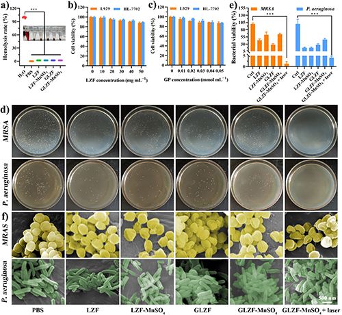 图3. 水凝胶的细胞毒性和光增强抗菌活性。