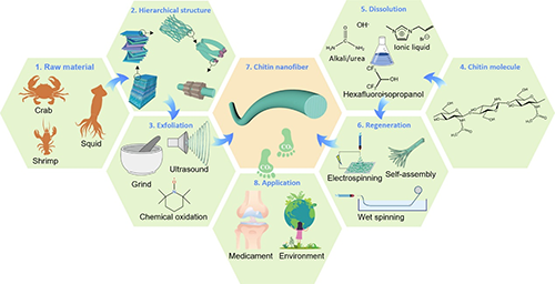 随着全球对气候变化和环境问题的关注日益增强,低碳材料在可持续未来中的重要性日趋凸显。甲壳素作为一种可再生的天然高分子材料,有望成为下一代功能材料的绿色基石。受生物体内纤维在多尺度下构建层级结构并由此决定其性能的启发,甲壳素纳米纤维在环境保护、医疗健康等领域展现出广泛的应用前景。因此,深入探讨甲壳素纳米纤维材料合成工艺中的环境影响,对于确保其在推动绿色发展过程中发挥关键作用至关重要。