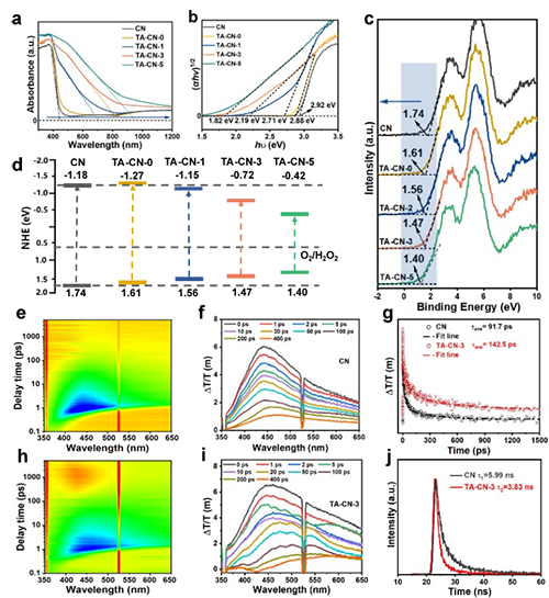 图4 (a)UV–vis-NIR吸收光谱;(b)带隙值;(c)VB-XPS光谱;(d)所制备样品的能带结构;(e, h)2D伪彩色表示;(f, i)在350 nm激发下,CN和TA-CN-3的瞬态吸收光谱观察到的瞬态漫反射光谱;(g)CN和TA-CN-3的飞秒分辨瞬态吸收动力学及相应的拟合结果;(j)CN和TA-CN-3的时间分辨光致发光(TRPL)光谱。