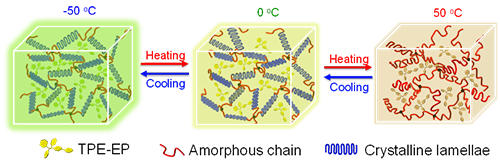图3. 含AIE分子的本体聚合物发光颜色和强度可逆变化的机理示意图。