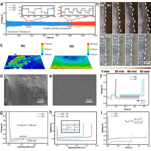 为了说明OC隔膜对钠电镀/剥离的影响,比较了不同隔膜的Na||Na对称电池和Na||Cu半电池的性能。使用OC隔膜组装的Na对称电池能稳定循环1400小时,且过电位始终保持在72mV左右,证明了该隔膜的界面稳定性。此外,原位枝晶观察和超景深显微镜也表明,OC隔膜能促进均匀的钠离子通量,诱导均匀Na沉积。如图2f-h所示,Na|OC|Cu电池98.4%的平均库伦效率更准确地评估了电池的循环效率,较低的成核过电位和更小的极化电压显示了OC隔膜优异的性能提升。