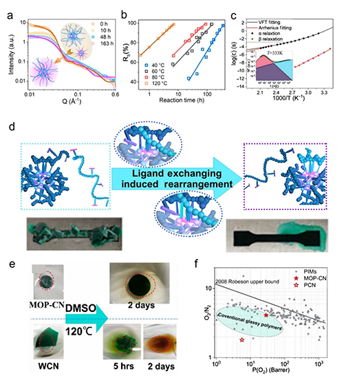 图6. (a)MOP配体交换过程的SANS图谱。(b)不同温度下MOP的配体交换动力学。(c)不同弛豫过程的松弛时间及温度依赖性。(d)基于MOP的vitrimer材料以及其再加工性能示意图。(e)vitrimer材料的耐溶剂测试,WCN为弱交联对照组。(f)基于MOP的vitrimer材料的气体分离性能。