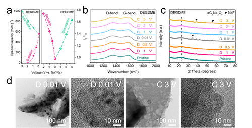 通过非原位表征,他们研究了CMFO负极在不同放电/充电电位的Na+储存机理(醚基电解质,0.05 A g-1下首圈GCD测试)。根据非原位Raman光谱,计算得到了CMFO负极在所有阶段的ID/IG值(图5a、b)。在储钠过程中,CMFO负极的ID/IG值逐渐下降,说明其有序结构的增加,这是因为缺陷对Na+的吸附。在脱钠过程中,CMFO负极的ID/IG值逐渐上升,说明其有序结构的减少,这是因为缺陷对Na+的脱附。上述现象表明,CMFO负极的蜂窝状微观结构在储存Na+时具有可逆性。如图5c所示,CMFO负极的非原位XRD图谱出现了NaF和C2Na2O4(2-COOH+2Na→2-COONa+H2)晶相——SEI层的主要无机组分。其中,NaF相存在于所有放电/充电阶段,说明了SEI层在静置过程中形成,在放电过程中发展,在充电过程中稳定,有助于提高ICE。此外,NaF基SEI层的厚度小、质量高、扩散活化能低(100-150 meV),有助于Na+传输。值得注意的是,在所有阶段中,CMFO负极几乎没有移动的(002)峰位(虚线标记处)表明,其没有明显的Na+嵌入/脱出行为。图5d展示了CMFO负极完全放电(D 0.01 V)或充电(C 3 V)时的非原位TEM图像。可以看出,在储钠/脱钠过程中,CMFO负极的蜂窝状微观结构几乎不变,证明了其结构稳定性和Na+存储可逆性。