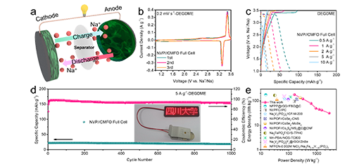 在本研究中,他们选用羧甲基纤维素钠为前驱体,碳酸氢钠为矿化剂和活化剂,硫脲为燃料,氮源和硫源,硝酸钠为氧化剂,成功制备了N,O和S三掺杂的蜂窝状多孔碳(CMFO)。CMFO的比表面积高达295m2 g-1且孔体积达到0.689cm3 g-1。在使用醚基电解质的SIB半电池中,CMFO负极提供了76.1%的高ICE,在0.05 A g-1和10 A g-1分别具有454.0 mAh g-1和136.1 mAh g-1的高比容量,在5 A g-1循环2000次后还有151.4 mAh g-1的比容量。此外,NVP//CMFO全电池具有177.7 Wh kg-1的高能量密度。并通过非原位表征解释了CMFO在醚基电解质中的储钠性能。