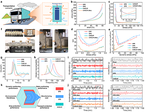 图5. 气凝胶与 EPE 和 EPS 的缓冲性能和模拟运输缓冲包装应用的比较。