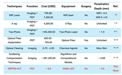 表 1. 一些先进的增强光组织穿透深度的技术汇总