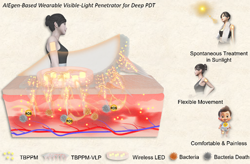 图1. 基于AIEgen的可见光穿透器用于深层组织感染的光动力治疗工作原理图