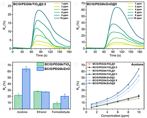 图四展示了细菌纤维素复合材料在不同挥发性有机物上的气体感应性能。结果表明,该复合材料对可挥发有机化合物具有较强的实时监测响应性能。含有氧化锌的复合材料在浓度为10 ppm的丙酮时表现出优异的性能,实时电阻变化值高达64%。氧化锌在甲醛检测方面也优于二氧化钛,而仅在乙醇检测方面,二氧化钛的峰值响应(28%)略优于氧化锌(27%)。与单纯使用纯石墨烯相比,使用石墨烯联合氧化锌或二氧化钛可以显著提高传感系统对挥发性有机物的响应速度和可逆性。含有二氧化钛的复合材料的最小可检测浓度约为1.43 ppm,足以分析人类呼出的丙酮以达到预诊断疾病功能。含有氧化锌的传感器表现出与甲醛浓度指数相关性和极低检测阈值。该灵敏度水平足以实时监测甲醛TLV浓度(0.75 ppm),以确保人类健康和日常工作的安全保护。