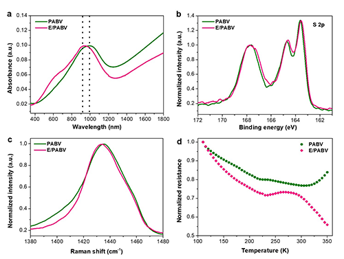 对比分析E/PABV与PABV可知,EMIM:DCA可进一步还原PABV。在230-270K的温度范围内,E/PABV的归一化电阻随着温度的升高而增加,随后,电阻随着温度的进一步升高而降低。这可以归因于DCA-和PEDOT+形成络合物中电荷转移释放了载流子。