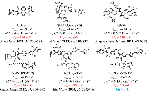 图2 对比基于FBDOPV-CNTVT和文献中报道的一些结构的n-型OECTs器件的性能