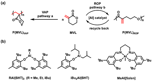 方案1. (a)MVL的两种聚合途径;(b)本文用到的有机铝配合物的化学结构