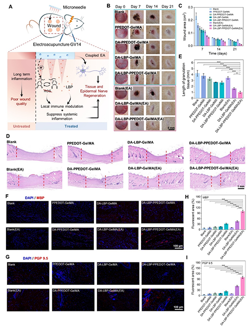 导电水凝胶微针主要由甲基丙烯酰基化明胶 (GelMA)、聚多巴胺修饰的聚(3,4-乙烯二氧噻吩)纳米粒子 (PPEDOT)多巴胺(DA和枸杞多糖 (LBP) 组成,协同EA刺激GV14促进糖尿病伤口愈合。通过以下方式取得了良好的治疗效果。(1)抑制全身炎症:GV14通过脊髓向大脑发送电信号,这些信号通过迷走神经-肾上腺轴刺激去甲肾上腺素的分泌,促进乙酰胆碱的释放,最终导致炎症因子的分泌下调,抑制全身炎症。电刺激GV14还可以通过提高5-HT水平来缓解抑郁症状;(2)局部免疫调节:导电水凝胶微针通过捕获EA产生的电子促进酚醌转换实现局部免疫调节,从而不断清除自由基、调节巨噬细胞表型、上调抗炎因子、下调炎症因子;(3)组织和周围神经再生:导电水凝胶微针耦合内源性电信号和外源性电刺激的反应,协同枸杞多糖 (LBP)促进伤口组织和表皮神经的修复。
