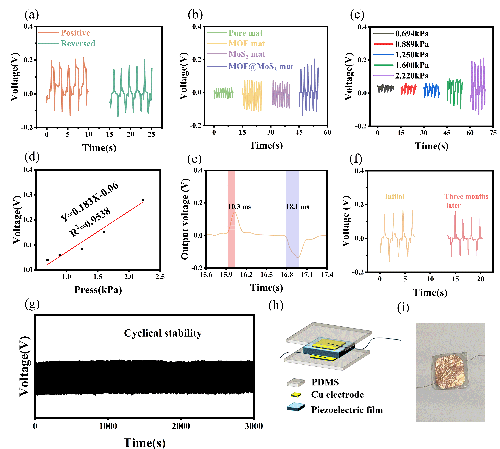 图4. (a)压电传感器正接、反接的压电输出,(b)不同传感器压电输出,(c)-(d) 0.5% MOF@MoS2(1:2)传感器灵敏度,(e)响应和恢复时间,(f)传感器漂移测试,(g)循环稳定性测试,(h)-(i)传感器结构图和光学图像。