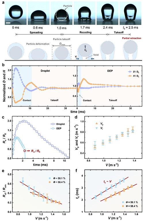 DEP的接触时间随撞击速度(V)的增加而明显变化,呈现出三种不同的变化区间(图 1d)。DEP的接触时间对撞击速度的独特依赖性与液滴形成了鲜明的对比,通常液滴的接触时间与速度无关。此外,在所有三种状态下,DEP的接触时间均明显短于液滴(约10毫秒),这表明液滴中包含的颗粒会从根本上改变弹跳动力学。