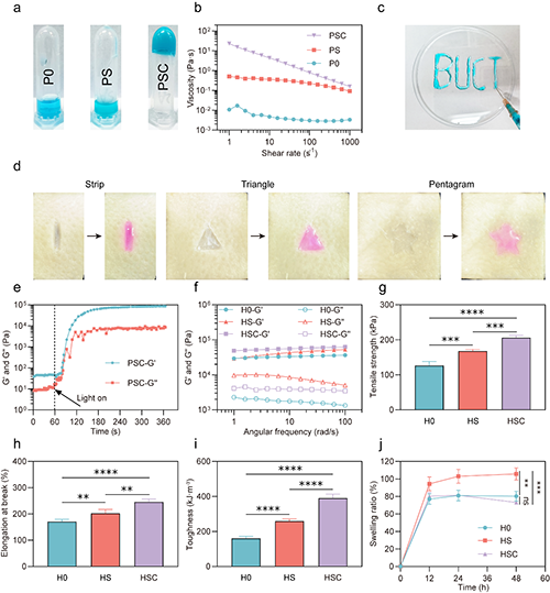 在这项工作中,研究者设计了一种原位光固化水凝胶,它具有优异的伤口顺应性,且能与牙周伤口牢固粘合。前驱体预凝胶PSC通过简单共混制备,海藻酸钠和Ca2+的离子交联增加了体系的粘度,可以短暂停留。PSC可以注射并适应伤口形状。在光照下,NAGA和AANHS快速聚合,形成坚固强韧的水凝胶。PNAGA的双氢键和预交联离子键之间确保了水凝胶的高机械强度和低溶胀率。水凝胶与组织之间表现出多种相互作用,包括填充和固化产生的机械互锁、PNAGA与组织之间的氢键以及AANHS与组织之间的酰胺键。这些物理和化学作用使水凝胶与组织之间产生了很强的界面粘附力。高效的光聚合过程也为水凝胶提供了强度,同时水凝胶还具有极佳的生物相容性。这种水凝胶具有出色的湿组织粘附性,可在牙周停留5天,优于临床上使用的膏状水凝胶和其他已报道的口腔生物粘合剂。它的高交联密度和强大的组织粘附力能有效防止细菌渗透,为伤口提供持久保护。在牙周炎伤口模型中,水凝胶在保护伤口、减少炎症和促进牙槽骨修复方面表现出了治疗效果。这项研究为设计新型、持久的口腔医疗敷料提供了有意义的启发。