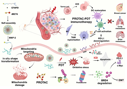 研究表明,dBET6@CFMPD呈现均一、稳定的球形,达到肿瘤部位后,由于其小尺寸,能够分布、渗透到肿瘤深部,并响应于微环境中高水平的MMP-2,由球形颗粒转变为纳米纤维,并释放PROTAC药物。这一特性能够提高PROTAC的分布和蓄积,并增强光敏剂在瘤内的渗透和滞留,提高PDT效益,促进肿瘤细胞的免疫原性死亡,激发抗肿瘤免疫。此外,纳米纤维能够进一步靶向线粒体,促进肿瘤细胞线粒体损伤,进一步促进肿瘤细胞的死亡。释放的dBET6能够降解肿瘤细胞的BRD4,下调c-Myc和上皮间质转化(EMT),促进肿瘤细胞的凋亡并抑制其迁移与侵袭。同时,dBET6能够下调PDT过程中上调的PD-L1以及调节T细胞的浸润,促进肿瘤相关巨噬细胞复极化为抗肿瘤的M1型,改善肿瘤免疫抑制微环境,进一步增强抗肿瘤效果。通过提高PROTAC-PDT效益和重塑免疫抑制微环境,dBET6@CFMPD能够激发宿主产生抗肿瘤免疫反应,抑制多种乳腺癌模型及其脑转移的进展。