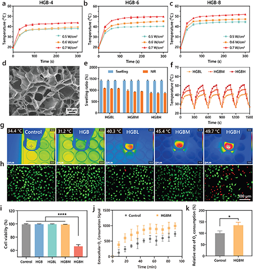 在本研究中,光热水凝胶HGBM展示了在组织热再生疗法中的广阔应用前景。借助氧化石墨烯(GO)的优异光热特性,该水凝胶能够通过精准调控光功率密度来调节治疗温度,具备稳定的光热循环能力与良好的体外生物相容性,显示出显著的临床应用潜力。温和的热刺激在伤口愈合初期能够诱导局部免疫反应的瞬时增强,进而上调与免疫反应、免疫细胞迁移和趋化、吞噬作用及抗炎因子(如IL-4和IL-10)合成相关的基因。此过程快速促进了活性氧(ROS)的产生与免疫细胞的募集,同时有效引导巨噬细胞表型转化,推动创面迅速过渡至抗炎和促愈合阶段。总体而言,HGBM光热水凝胶通过有序引导免疫反应及随之而来的抗炎微环境,精确调控炎症的发生和消退,充分激发创面内源性修复潜力,促进再上皮化和胶原蛋白沉积。该研究不仅揭示了温度对伤口愈合过程中再生作用的机制,也为热再生疗法作为单一治疗手段或与现有疗法联合应用提供了重要的理论依据与实践启示。