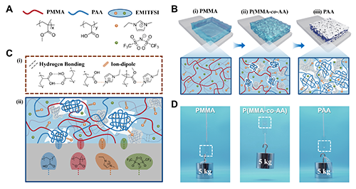 图1. 微相分离离子凝胶胶粘剂的结构与粘附性能示意图