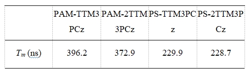 遵循DiVincenzo标准,高自旋态在构建具有多个量子态的量子系统中起着重要作用,而长的自旋相干性时间会更有利于量子信息处理。在本研究中,发光自由基聚合物不仅具有高自旋态特性,同时展现出有较长的自旋相干时间(Tm)。为了评估这些材料的自旋特性,研究团队利用X波段脉冲电子顺磁共振(EPR)技术,在室温下对所有发光自由基聚合物进行了回波检测场扫描(EDFS)测量,成功观察到明显的自旋回波现象,从而确定了它们的g因子(图3a和3b)。此外,通过哈恩回波实验,研究人员测得了室温下这些发光自由基聚合物的Tm,并通过拟合回波衰减曲线得到自旋相干时间的值(图3c)。PAM-TTM3PCz的Tm值为396.2 ns,PAM-2TM3PCz为372.9 ns,超过了对比材料PS-TTM3PCz的229.9 ns和PS-2TTM3PCz的228.7 ns(表1)。这一延长的Tm意味着量子位能够在更长时间内保持其量子态,从而增强了信息存储的稳定性。