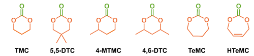 以二氧化碳为可再生原料合成聚合物已经成为全球研究热点,目前成熟的技术仅有其与环氧烷烃共聚合成聚碳酸酯。聚碳酸酯还可由环碳酸酯开环聚合制得,该方法中单体合成和聚合均无需高压,能在温和条件下进行,且对多种取代基、杂原子都有良好的适应性。另一方面,烯烃和二氧化碳的共聚物受到的关注较少。最近十年,二氧化碳和1,3-丁二烯的反应产物—δ-戊内酯EVL因其高达29%的二氧化碳质量分数和多烯基取代的结构特点成为二者共聚的重要中间体,备受关注。EVL开环聚合得到的可降解聚酯含有大量可供聚合后修饰的碳碳双键,在功能性材料领域具有应用前景。